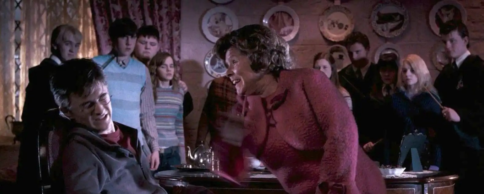 Despite Umbridge’s position as an instructor charged with teaching young students how to properly defend themselves, she has no real interest in teaching hers any lessons that will meaningfully equip them to address what they’ll face as adult wizards. She fixates on an outdated curriculum preparing them for one standardized test slotting them into rigidly-defined categories of wizardry, but as soon as Harry pries her for practical applications and challenges her geriatric complacency in the face of the looming threat that the Death Eaters pose, she throws a fit and punishes him. Because for a powerful old person like her who has done well for herself under the status quo, the most important thing on her mind is just reinforcing deference to that. Genuinely empowering younger wizards and witches gives them the ability to significantly influence the world around them in the future, and maybe even change things away from what she’s content with. The way the Ministry of Magic has run things since she was a young witch-in-training is, in her mind, sufficient forever and there’s no need to question if it’s out-of-touch or inadequate to defeat the new darkness threatening everyone right now.