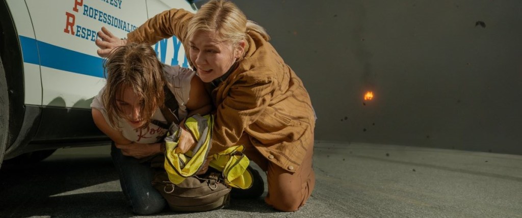 We meet veteran war photographer Lee Smith (Kirsten Dunst) in her New York hotel room, watching the President of the United States (Nick Offerman) deliver an address. He’s hailing victories against the so called insurrectionists of the Western Forces. He also mentions the Florida Alliance, as well as one between California and Texas. It only takes the look on her face, as well as his delivery, to know that the nation has crumbled. Lee and her journalist partner Joel (Wagner Moura) have it on good intelligence that the Loyalist States have lost, that the Western Forces are preparing to invade Washington, and that the President’s days are numbered. They plan to get to DC before that and interview/photograph him.