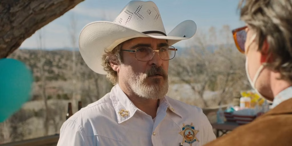 In May of 2020, the town of Eddington, New Mexico, is about to become a powder keg. Joe Cross (Joaquin Phoenix) the sheriff of the small town is at loggerheads with Mayor Ted Garcia (Pedro Pascal). Not only do they disagree with the COVID mask mandates instituted by the Governor, with Joe claiming his asthma prevents him from masking, he believes that Ted took advantage of his wife Louise (Emma Stone) when she was younger. Louise’s conspiracy theory nut mother Dawn (Deirdre O’Connell) lives with her and Joe, blathering on day and night about all manner of 2020 lunacies. When one particular encounter between Joe and Ted gets filmed and some of the more conservative townsfolk show support to Joe, he impetuously launches a campaign to unseat the incumbent Mayor.